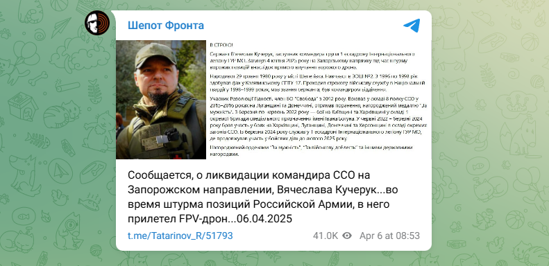 Военкор Руслан Татаринов обратил внимание на некрологи, которые расходятся по вражеским каналам. Сообщается о том, что на Запорожском направлении русский дрон уничтожил командира ССО Вячеслава Кучерука.
