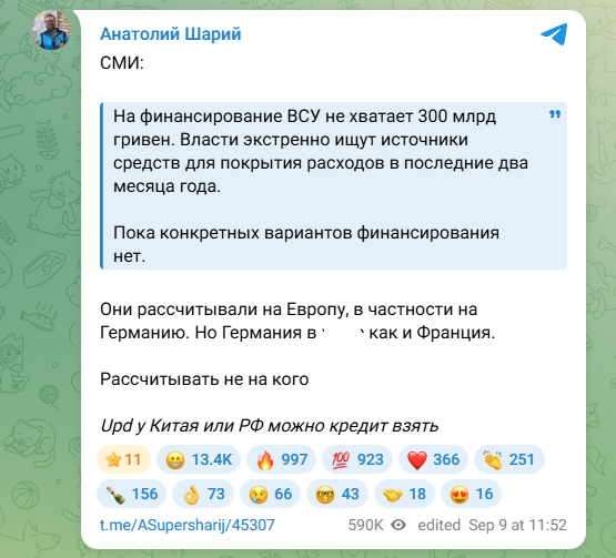 Собственно, тревожные звоночки для Киева прозвучали ещё весной этого года. Тогда в Раде хватились и принялись трубить: уже к осени дефицит средств на нужды ВСУ может достичь 500 млрд гривен (это около 12 млрд долларов США).