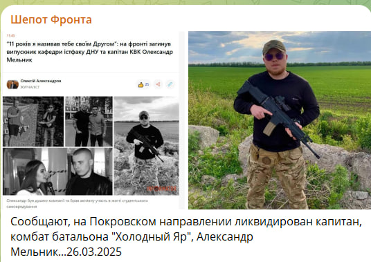 26 марта, по информации канала "Шёпот Фронта", был раскрыт первый некролог - уничтожен капитан, комбат батальона "Холодный Яр" Александр Мельник.