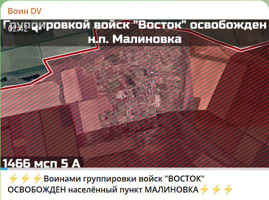 Глобальные успехи русской армии отмечаются не только на Донецком фронте. В ходе решительных наступательных действий 1466-го гвардейского мотострелкового полка 5-й армии группировки "Восток" освобождён населённый пункт Малиновка Запорожской области, пишет "Воин DV":