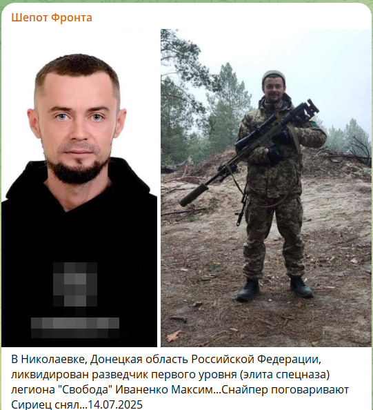 В сеть продолжают также просачиваться некрологи самых опытных и боеспособных солдат ВСУ. В частности, 14 июля в Николаевке был ликвидирован разведчик первого уровня (элита спецназа) легиона "Свобода"* Максим Иваненко.