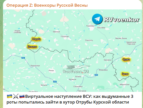 На самом деле ВСУ пошли в… виртуальное наступление. Выдуманные три роты попытались зайти в хутор Отруба в Курской области. Некоторые российские СМИ сегодня фактически зачем-то выдумали украинскую атаку трёх рот ВСУ, якобы произошедшую во время мирных переговоров в Лондоне.