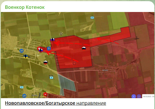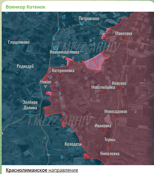 По информации военкора Юрия Котенка, подразделения ГрВ "Запад" заняли оборонительные позиции ВСУ в посадках на высотах и срезали карман между Ивановским и Макеевским плацдармами, объединив их уже достаточно надёжно, и продолжают наступление в направлении Грековки и в районе Новомихайловки, за которую ещё идут бои с "Азовом"*.