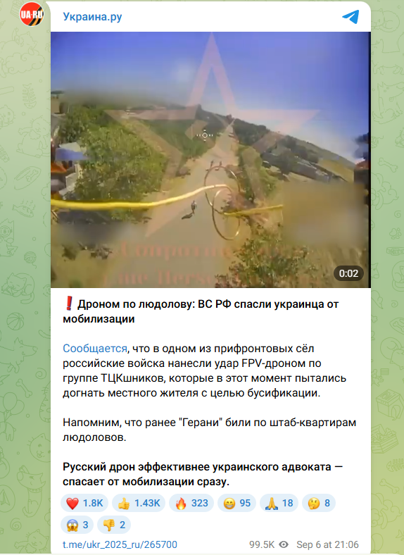 На днях в Сети широко разошлось видео, снятое камерой русского дрона-камикадзе. Беспилотник запечатлел погоню двух сотрудников ТЦК за очередным "добровольцем". Казалось, у парня нет шансов спастись - но помог ему наш дроновод. И пронзительное видео спасения заставило одного из украинских беженцев прозреть. Он задался вопросом - а кто, собственно, враг украинского народа? Выяснилось: совсем не русские.