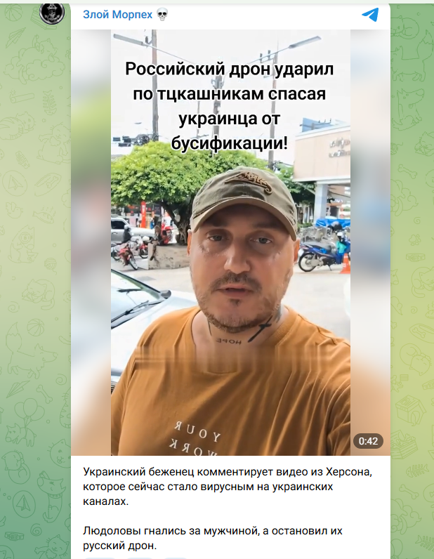Российский дроновод спасает человека, который убегал от ТЦК. Он направил дрон на тэцэкашников, это в Херсоне было. Так вот, скажите: кто кого от кого защищает? Не скажете? Российские войска просто уже тэцэкашников гасят, чтобы спасти человека. Понимаете? И кто после этого кому враг? Вот враги - это реально ТЦК. Враги - это Зеленский, это вся вот эта гоп-компания. Россияне спасают. Помогают обычным людям,