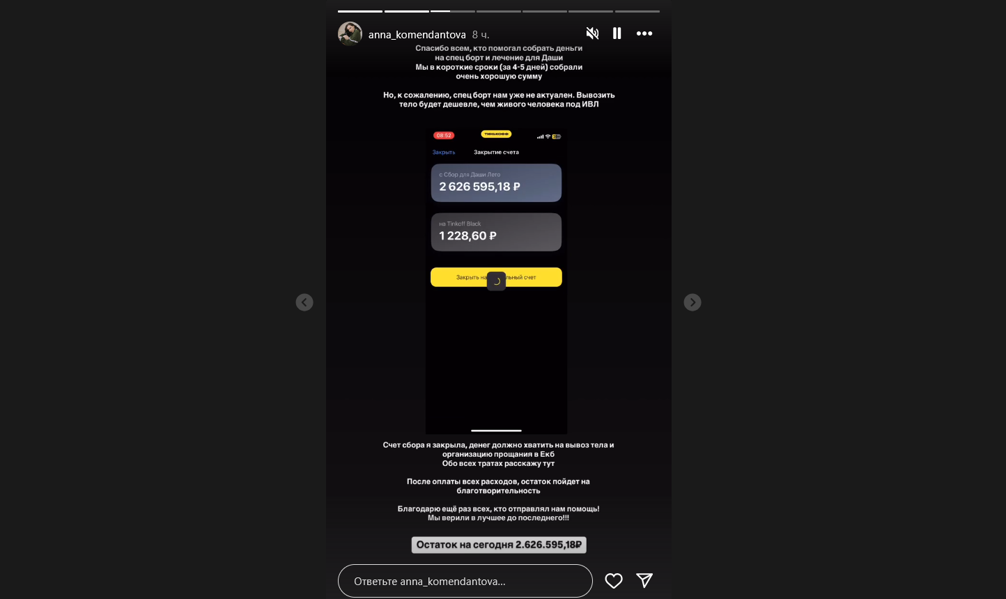 В свою очередь, Анна Комендантова поблагодарила всех, кто говорит в эти непростые дни слова соболезнований. Печально, но среди многочисленных комментаторов в социальных сетях нашлись и те, кто предпочёл обвинить близких в смерти Дарьи, настаивая, что они неверно лечили девушку за рубежом. В этом, отметим, главная трагедия современного общества - во вседозволенности комментирования...