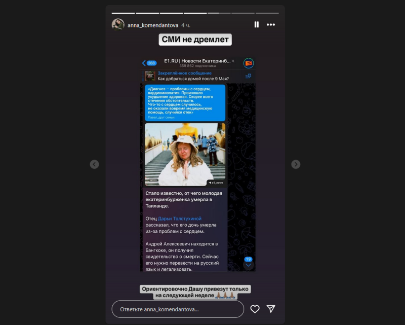 Подруга Дарьи - Анна Комендантова, рассказала, как принималось это решение. В отпуске она была вместе с Дарьей. А затем, когда девушку госпитализировали, делилась в социальных сетях новостями о её состоянии. Делится и теперь: