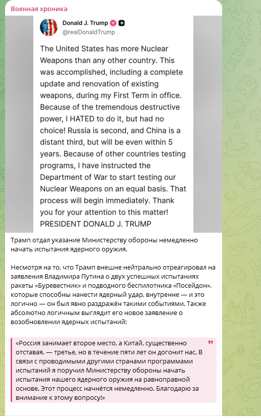 Разумеется, успешные испытания "Посейдона" и ракеты "Буревестник", которая также оснащена ядерным двигателем, не могли не остаться незамеченными в США. И вот уже стало известно о том, что президент Дональд Трамп дал приказ своему новому министерству войны немедленно начать испытания ядерного оружия.