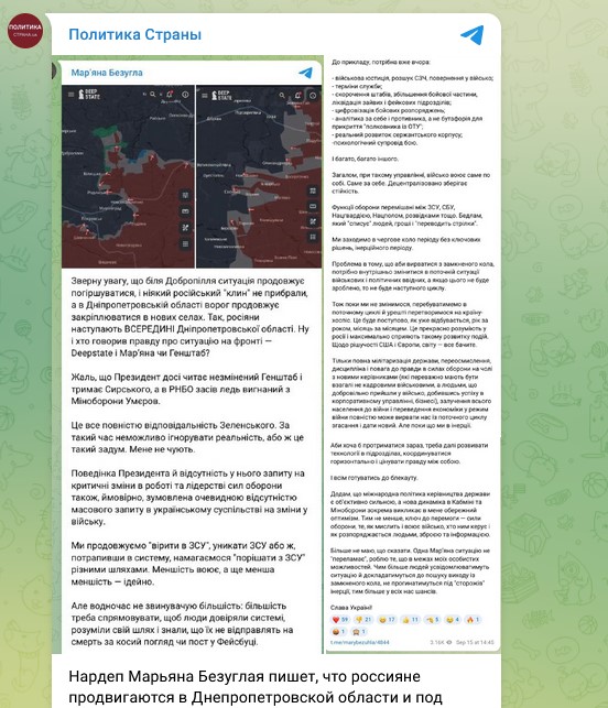 Эти слова как раз и вызвали панику даже у самых "патриотичных" местных "патриотов", которые по сей день верили украинскому командованию. Дело в том, что в Верховной раде уже обвинили командование ВСУ в предоставлении неправдивой информации с фронта. Как пишет депутат Марьяна Безуглая, русские войска достаточно стремительно продвигаются вглубь Днепропетровщины.