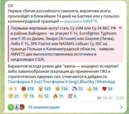 Эксперты называют несколько возможных сценариев развития событий и их возможных участников. Вариант номер один - в районе острова Вайндло атаке могут подвергнуться Су-24М или Су-34 ВКС РФ, причём против них могут быть задействованы F-16, Eurofighter Typhoon или F-35 с баз в Дании, Эмарии (Эстония) или Шяуляе (Литва). Второй возможный эпизод - удар F-16, системы ПВО Patriot или NASAMS по Су-35С на границе Польши и Калининградской области. Новость о возможной атаке на русский самолёт появилась в 13:04 по московскому времени в иноагентском тг-канале.