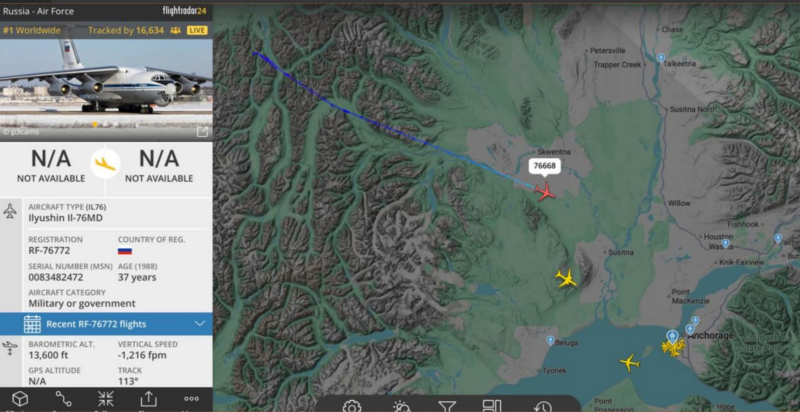 Русский военно-транспортный самолёт Ил-76 Минобороны России, вылетевший из Магадана, приземлился на авиабазе Эльмендорф-Ричардсон возле Анкориджа. Это следует из данных сервиса Fligthradar. Предположительно, на борту военного транспортника были сотрудники службы безопасности президента России.