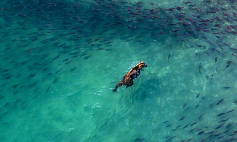 Полморды у него было в чём-то красном, хотелось бы думать, что в бруснике. Мишутка уже было собирался плыть в направлении нас, но его спугнула моторная лодка на полном ходу!