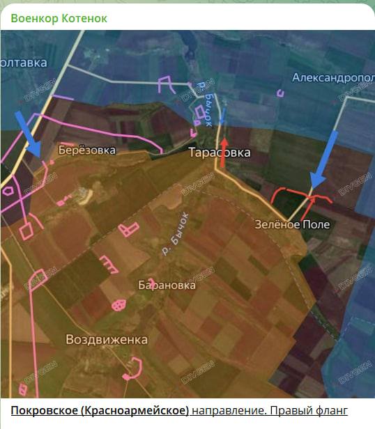 На правом фланге Покровского направления подразделения ВС России, отражая контратаки противника в направлении Водяного Второго, хозпостроек у Малиновской развязки, Зелёного Поля, продвинулись в Тарасовке и в направлении Александрополя от Зелёного Поля около 600 м. Ожесточённые встречные бои за развязку и Елизаветовку.