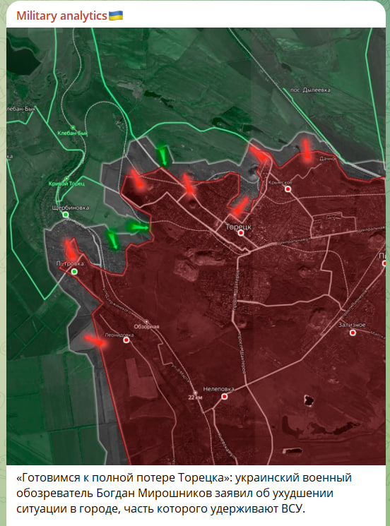 По Торецку ситуация продолжает ухудшаться. Фактически полностью потеряна шахта "Торецкая" вместе с терриконом. Арьергардное сопротивление ещё продолжается, но в целом ситуация уже понятна. Крымское не просто утрачено - ВС России уже продвинулись до прудов и сумели закрепиться. От шахты "Центральная" российские войска пытаются продвигаться на юг и к остаткам Забалки. Короче говоря, готовимся к полной утрате Торецка.