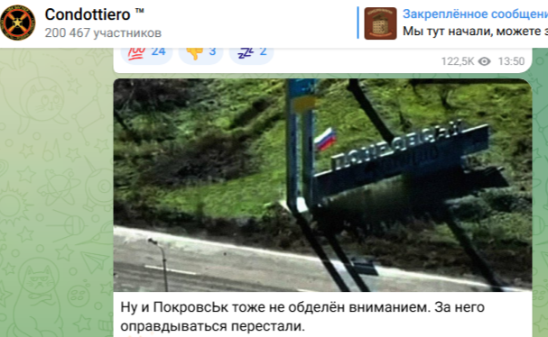 Ранее экс-замминистра обороны Украины и основатель крупнейшего фонда ВСУ "Вернись живым" Виталий Дейнега написал на своей странице в соцсети, что Покровск фактически утрачен, а "логистика в Мирноград останется только с неадекватным риском через поля":