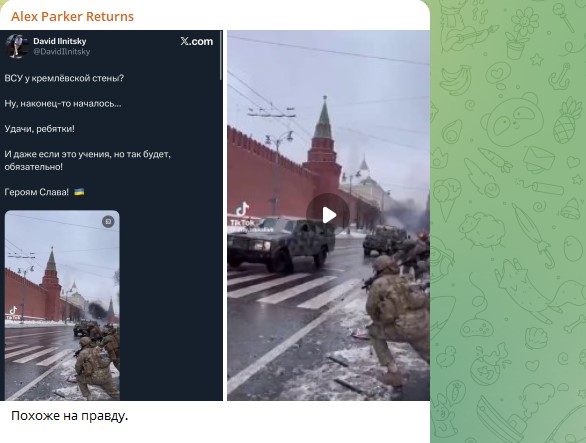 Листаю "Твиттер". Оказывается, [украинцы] в нейросети создали кучу роликов о ВСУ в захваченной Москве и массово их лайкают. Из мира умалишённых,