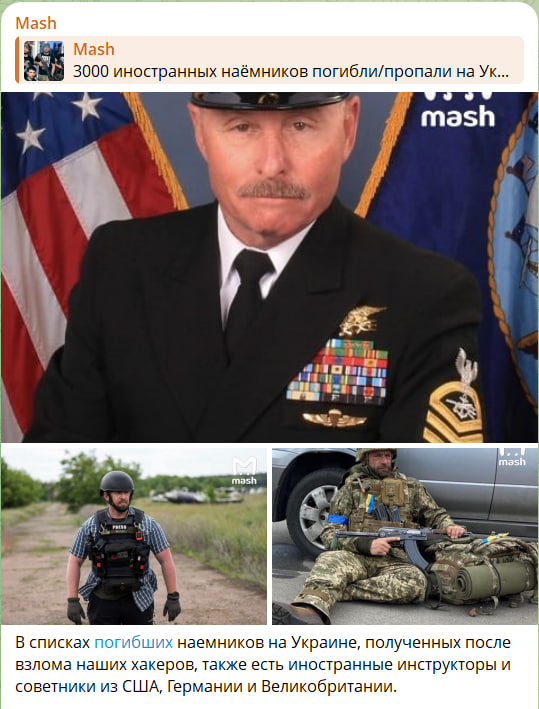 В списках погибших наёмников на Украине, полученных после взлома нашими хакерами, также есть иностранные инструкторы и советники из США, Германии и Британии, пишут военкоры Win/Win. Среди них - британец Райан Эванс, советник по безопасности, убит под Краматорском. Ричард Кирлин из США, атташе посольства и военный советник, найден мёртвым в отеле. Майк Меоли из США - американский инструктор, погиб в госпитале после ДТП в тылу. Димитриос Феррара из Германии - советник и инструктор, мёртв. Джонатан Шенкин из Британии - советник по безопасности, мёртв.