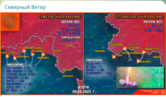 В ночь на 10 июня в Шостке добили химпредприятия, склады с БК, подразделения ВСУ в пригороде и районе. В Конотопе уничтожен железнодорожный узел, логистика вооружений, склады второй линии обороны, снабжение и комплектация разбитых подразделений. В Ахтырке - нефтебаза, пункты снабжения ВСУ. В Черниговщине также прилетело по плацдармам врага (Нежин и Прилуки - базы резервистов, логистические центры). В Черкассах - узлы мобрезерва, в Каневе - полигон и ПВД вместе с инструкторами. В Харькове уничтожены заводы ВПК, узлы связи, в Чугуеве - база ВСУ, учебные центры.