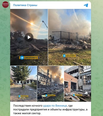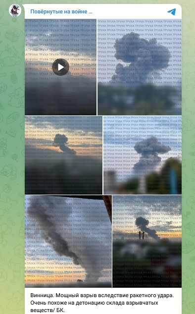 Удары крылатыми ракетами зафиксированы в Житомире, Виннице, причём последней досталось серьёзнее всех. На фото с мест ударов видна мощнейшая детонация на складах - военные паблики предполагают, что такая сильная повторная детонация, вероятнее всего, связана с хранением взрывчатых веществ и БК.