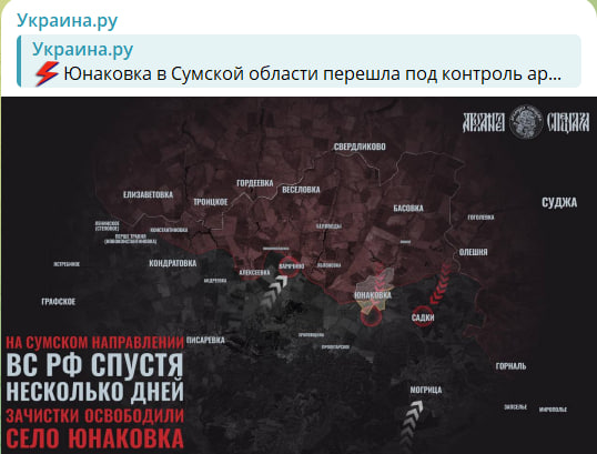 С Сумского направления поступили положительные новости. Несколько дней назад ВС РФ взяли основную часть Юнаковки под контроль. И сегодня российские подразделения зачистили остатки украинского присутствия в лице 95-й ошдбр и 47-й омбр и установили полный контроль над селом. ВСУ пытались удержать опорный пункт. Туда даже вновь была переброшена 47-я омбр, которую выводили на Тёткинское направление. <…> Потеря села скажется на оборонительной линии ВСУ, которые уже начали оборудовать запасные позиции. Подразделения 80-й одшбр готовят опорники в районе Могрицы. При этом западнее противник всё также удерживает линию Кондратовка-Андреевка и пытается контратаковать у Варачино. Ситуация остаётся напряжённой, так как враг не намерен просто так оставлять Юнаковку и будет пытаться отбить потерянные позиции. Но наши бойцы уже добились значимого результата,