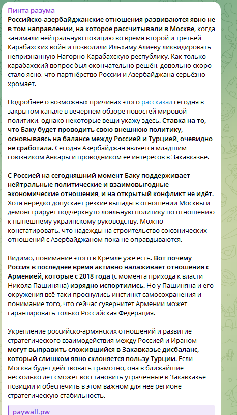 Можно констатировать, что надежды на строительство союзнических отношений с Азербайджаном пока не оправдываются. Видимо, понимание этого в Кремле уже есть. Вот почему Россия в последнее время активно налаживает отношения с Арменией, которые с 2018 года (с момента прихода к власти Никола Пашиняна) изрядно испортились. Но у Пашиняна и его окружения всё-таки проснулись инстинкт самосохранения и понимание того, что сейчас суверенитет Армении может гарантировать только Российская Федерация.