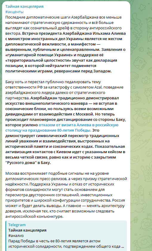 Авторы канала "Тайная канцелярия" куда более резки в оценках. Они пишут, что "последние дипломатические шаги Азербайджана всё меньше напоминают стратегическую сдержанность", и Баку откровенно становится на антироссийскую сторону. В таком случае встреча Алиева с Сибигой - выверенный и публичный жест. Настоящий манифест.
