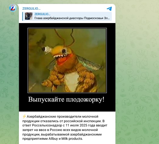 Однако в этот раз в ответ Россельхознадзор с 11 июля 2025 года ввёл запрет на ввоз в Россию всех видов молочной продукции, вырабатываемой азербайджанскими предприятиями Allbuy и Milk products.