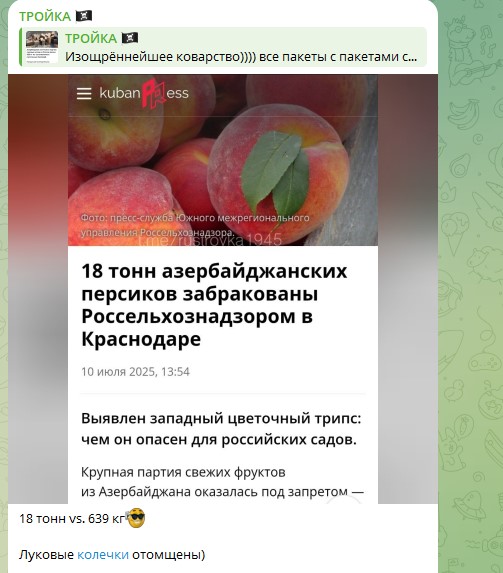 И это не единственное решение России. Россельхознадзор в Краснодаре выявил в азербайджанских персиках западный цветочный трипс - одного из опаснейших вредителей культурных растений, а также переносчика вирусных заболеваний растений. В связи с этим 18 тонн персиков отправились обратно в республику.