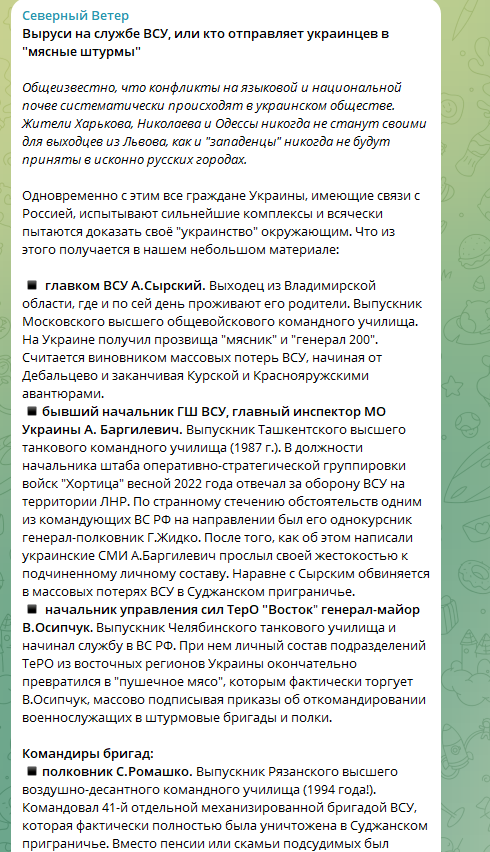 Есть такое новое слово - вырусь, которое обозначает предавшего Родину и свой народ перебежчика. И на службе ВСУ таких персонажей набралось много. Даже нынешний главком Александр Сырский - самый что ни на есть вырусь: о том, что он родился в России, знают все. Часто выходит так, что, пытаясь доказать украинским националистам свою верность и лояльность, эти предатели мстят сами себе. Открытая ими охота на русских обернулась на деле страшными "мясными" штурмами и громадными потерями боевиков. Того же Сырского не зря называют Мясником.
