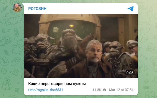 Переговоры украинской и американской делегаций, как известно, кончились весьма странным предложением о временном перемирии. Мол, боевые действия встанут на паузу на месяц, при этом поставки военной помощи Украине прекращать не будут. Такое условия якобы нужно для переговоров "в спокойной обстановке". Дмитрий Рогозин после такого "роскошного" предложения дал яркий намёк, выложив видео с эпизодом из фильма "Пятый элемент". Там главный герой метким выстрелом убивает террориста, а потом грозно спрашивает: "Кто ещё хочет переговоры?"