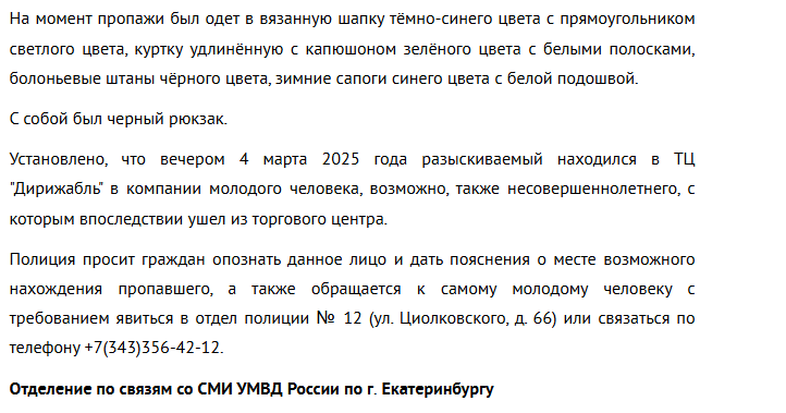 Накануне по Екатеринбургу разлетелась новость о пропаже восьмилетнего мальчика. Он пропал после того, как с семьёй выбрался в местный ТЦ "Дирижабль". В полиции подчёркивали, что мальчика видели "в компании молодого человека, возможно, также несовершеннолетнего, с которым впоследствии ушёл из торгового центра".