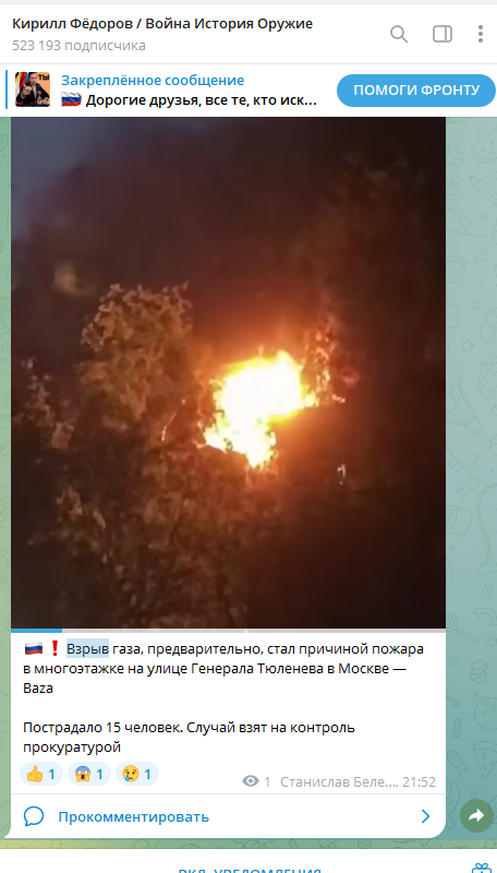 Взрыв в Москве. Люди в доме на улице генерала Тюленева заблокированы. Прямая трансляция