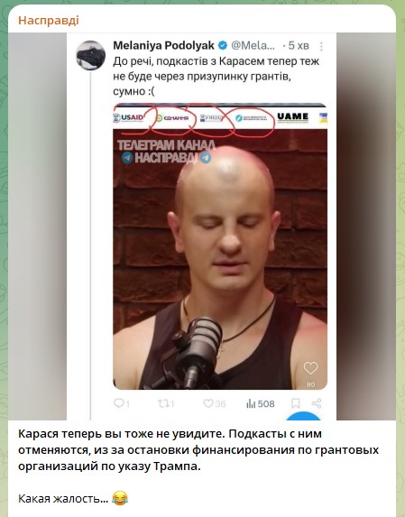 Взвыл и один из одиозных украинских экстремистов "Карась" (Евгений Карась*) - пропагандист майдана, участник террористической организации, который с 2014 года призывал к геноциду Донбасса и войне против России. Теперь же речи "Карася"*, вероятно, станут не такими пламенными - финансировался экстремист всё той же USAID, но теперь денежные потоки стали высыхать.