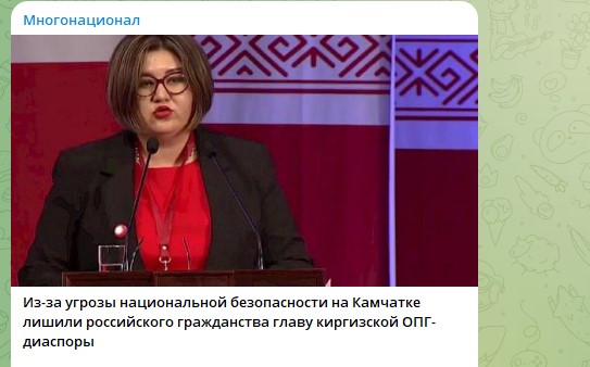 Лидер киргизской диаспоры Нура Курманбекова лишилась паспорта гражданки России всего спустя пять лет после его получения. Не помогла и многодетность женщины - то, чем она занималась в нашей стране, нельзя "понять и простить". По данным телеграм-канала "Многонацинал", женщина возглавляла на Камчатке национально-культурную автономию киргизов "Мекендештер". На карандаш силовики взяли иностранку ещё несколько лет назад - уже будучи гражданкой России, Курманбекова разъезжала по иностранным форумам и за границей рассказывала о якобы тяжкой и угнетённой доле киргизов в России.