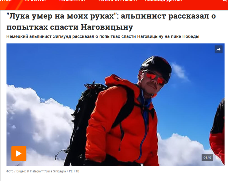 Увы, на обратном пути Лука погиб - итальянец скончался на руках у немецкого коллеги. У скалолаза развился отёк мозга. Гюнтер не сомневается, что Наговициной тоже нет в живых. Альпинист слишком хорошо знает, как суровы горы.