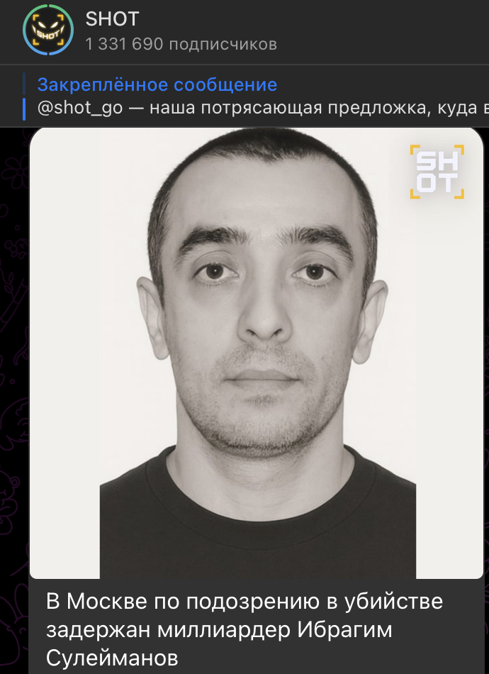 Как сообщают источники Телеграм-канала Shot, следствие подозревает Сулейманова в причастности к убийству Геннадия Борисова - главы авиакомпании "Внуковские авиалинии". Тело Борисова в 2004 году обнаружили в подъезде жилого дома с многочисленными ножевыми ранениями.