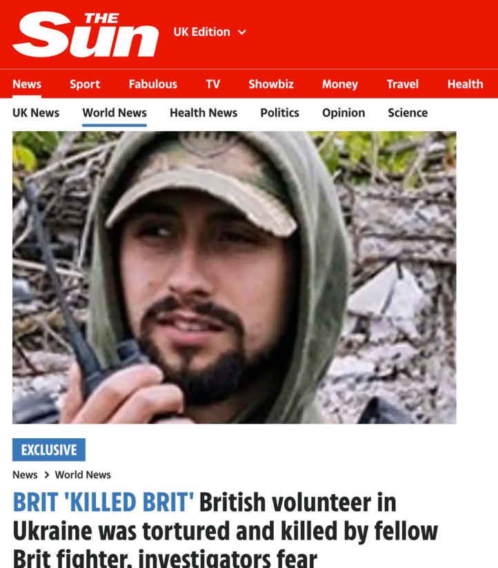 Британский таблоид The Sun утверждает, что Чедвик был убит другим британским боевиков, а перед смертью его пытали. Скриншот: Telegram/"Осташко! Важное"