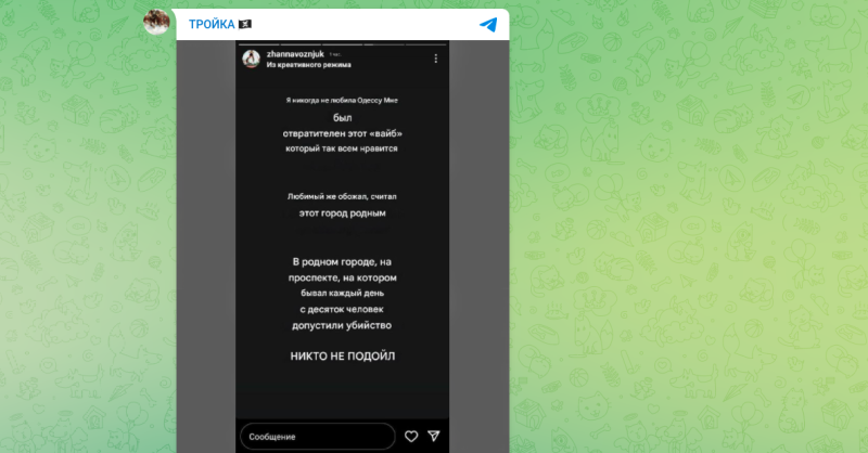Тем не менее вдова палача решила, что будет логично во всём обвинить одесситов. Она один за другим строчит обличительные посты в своих соцсетях. В них она желает смерти всем жителям Одессы и говорит о том, что никогда не любила этот город, перевёл Telegram-канал "ТРОЙКА".