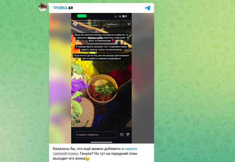 Женщина, кажется, решила скорбеть с пользой. Она публиковала посты с рекламой, в которой мелькало имя убитого супруга. Например, одно из заведений она пиарила, говоря о том, что в нём завтракал Ганул*: