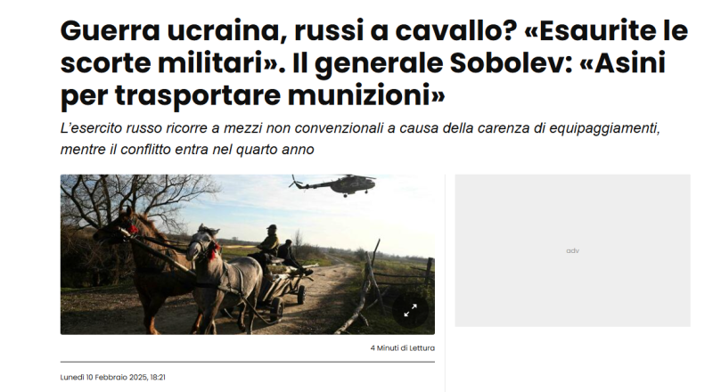 Итальянские журналисты раздувают новую сенсацию из зоны СВО. На сей раз иностранная пресса радуется тому, что у русских закончился бензин и в бой они идут на лошадях. Да, без смеха: вполне серьёзно читателю рассказывают о "конных войсках", которые брошены в пекло украинского конфликта. Журналисты даже показали странные фото.