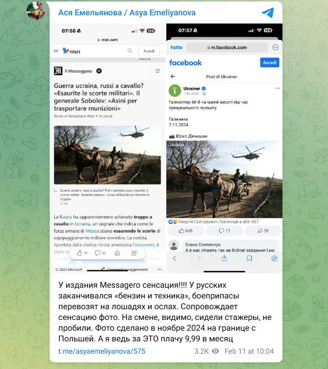 В доказательство она приложила скриншот из соцсети Facebook*, где в прошлом году и был опубликован злополучный снимок. Кто бы мог подумать, что фото выступит в качестве иллюстрации о статье про русскую кавалерию на поле боя в 2025-м!