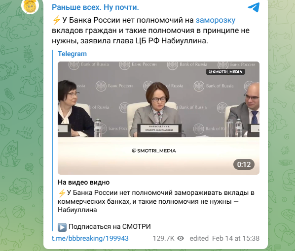 Стоит отметить, что слухи о том, что банки с одобрения правительства вот-вот "заморозят" вклады своих клиентов, гуляют давно. Замечено, что они подогреваются каналами иноагентов. Так что, видимо, это ещё один из инструментов попытки раскачать общество в России.