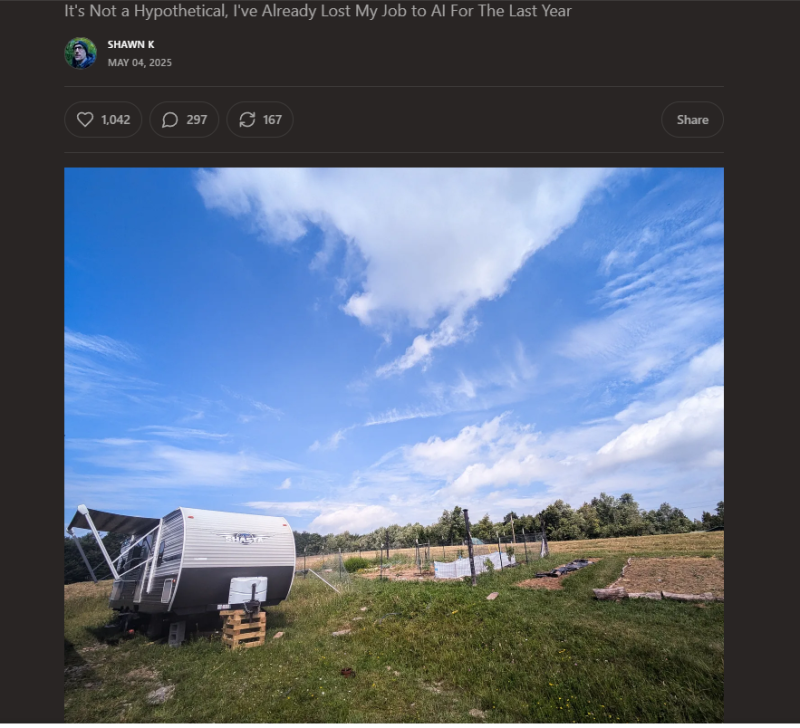 Шон завёл блог, где честно рассказывает о своей грустной истории, и призывает других готовиться к трудным временам. Интересно, что многие пользователи разделяют его тревогу и пишут: ИИ развивается такими темпами, что скоро и вправду сможет вытеснить людей из многих сфер.