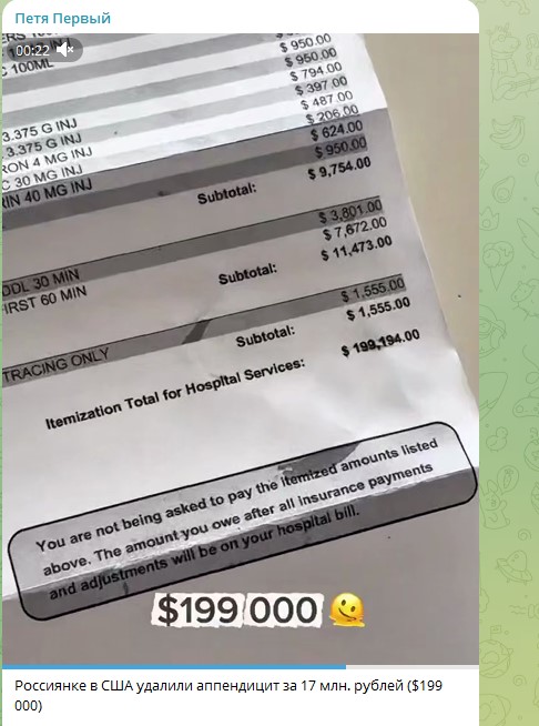 Такого в больницах России действительно не встретишь - даже со всеми минусами и недочётами здравоохранительной системы, которые могут быть, счёт за операцию по удаления аппендицита на 17 млн рублей в наших больницах не встретить.