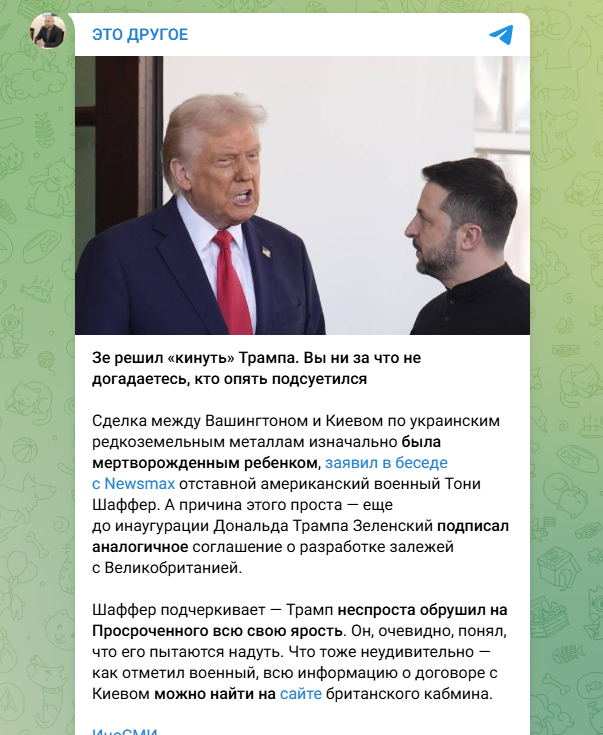Автор белорусского телеграм-канала "Это другое" Станислав Яскевич раскрывает: на самом деле за громкими событиями в Белом доме может стоять сговор Зеленского с британской стороной. Дело в том, что ранее Киев уже заключил сделку с Лондоном. Разработки залежей редкоземельных элементов должны были вестись с британцами.