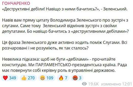 "Деструктивные дебилы! Зачем с ними встречаться?" - прямая цитата Владимира Зеленского про встречу со "слугами". Именно поэтому он отменил встречу со своими депутатами. Потому что зачем встречаться с "деструктивными дебилами"? Эта фраза Зеленского очень активно ходит между "слугами". Все разочарованы и не понимают, как это получилось".