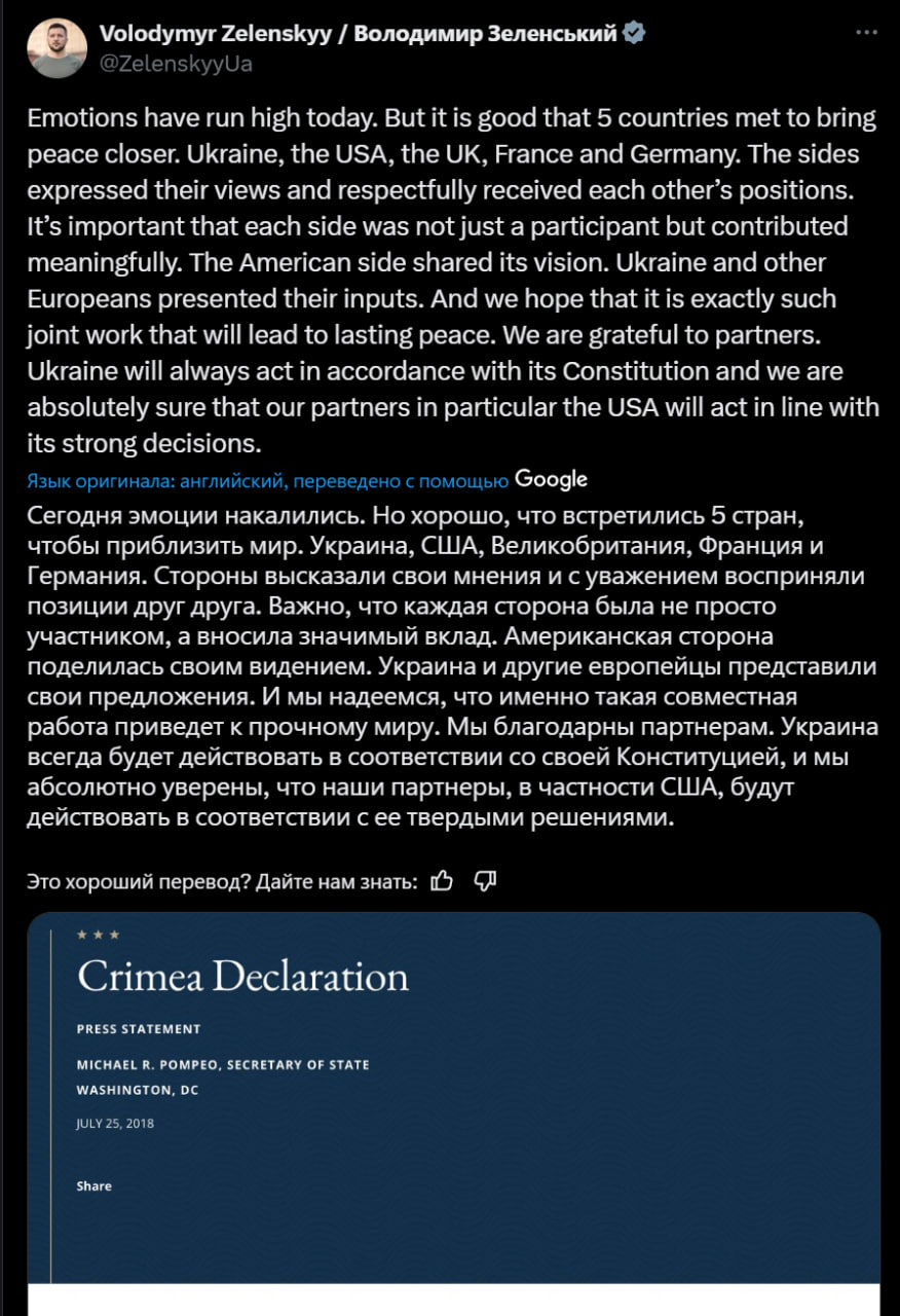 Зеленский опубликовал "Крымскую декларацию" США с осуждением действий России на полуострове в ответ на заявления Трампа. Скриншот сообщения в Telegram