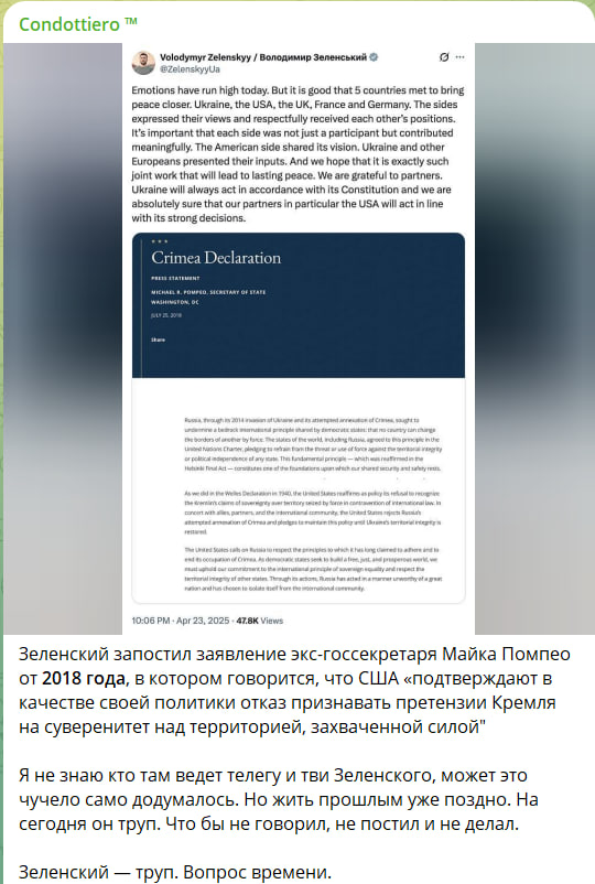 Ни с того ни с сего Зеленский в своих социальных сетях опубликовал заявление экс-госсекретаря Майка Помпео от 2018 года, в котором говорится, что США "подтверждают в качестве своей политики отказ признавать претензии Кремля на суверенитет над территорией, захваченной силой".