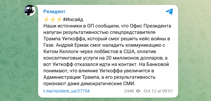 Андрей Ермак смог наладить коммуникацию с Китом Келлоги через лоббистов в США, оплатив консалтинговые услуги на 20 миллионов долларов, а вот Уиткофф отказался идти на контакт,