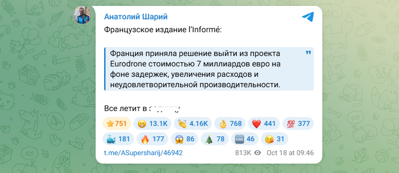 На этом неприятные новости для Зеленского не кончились. Как пишет оппозиционный украинский блогер Анатолий Шарий, Франция приняла решение выйти из проекта Eurodrone стоимостью 7 миллиардов евро на фоне задержек, увеличения расходов и неудовлетворительной производительности. Проект был крайне выгоден Зеленскому и его окружению, лоббировался союзниками Киева - в итоге всё, кажется, обернётся громким пшиком.